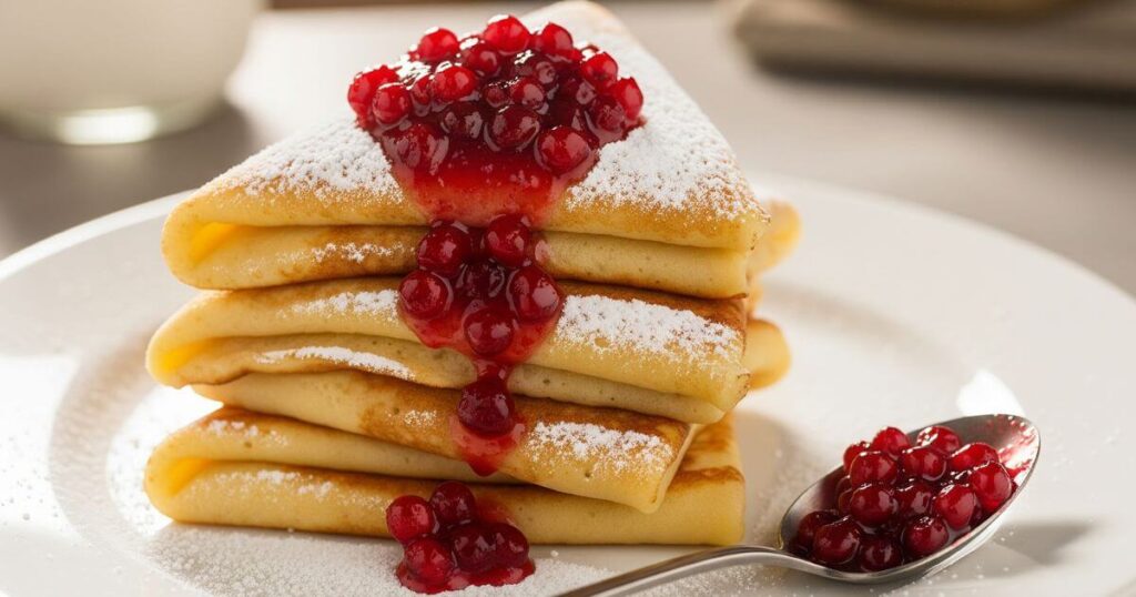 Heat a heavy pan (cast iron is ideal) over medium-low heat(this is crucial – unlike high-heat American pancakes). Melt a small pat of butter, then pour 2-tbsp portions of batter. Cook until edges look dry and bubbles form on top (~2-3 minutes). Gently flip when golden underneath (Swedish pancakes are slightly thicker than American versions). Cook for 1-2 more minutes until cooked through.