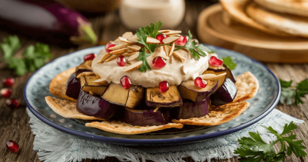 kcalEggplant Fatteh a vegetarian recipe loved for its unique layers of texture and flavor. Eggplant Fatteh, or Fattet Baitinjan, is a perfect vegetarian middle eastern delight, prepared with crispy pita chips, tender roasted eggplant, and a creamy, tangy yogurt tahini sauce.